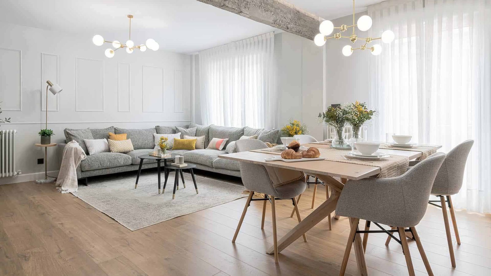 Las vigas vistas y las molduras decorativas de las paredes nos trasladan a un pasado señorial, mientras la decoración aboga por un estilo moderno y nórdico.